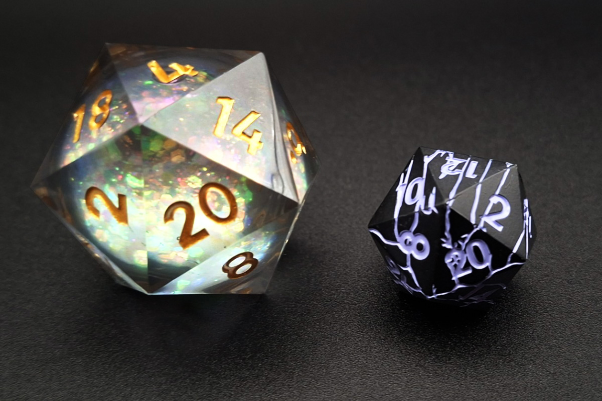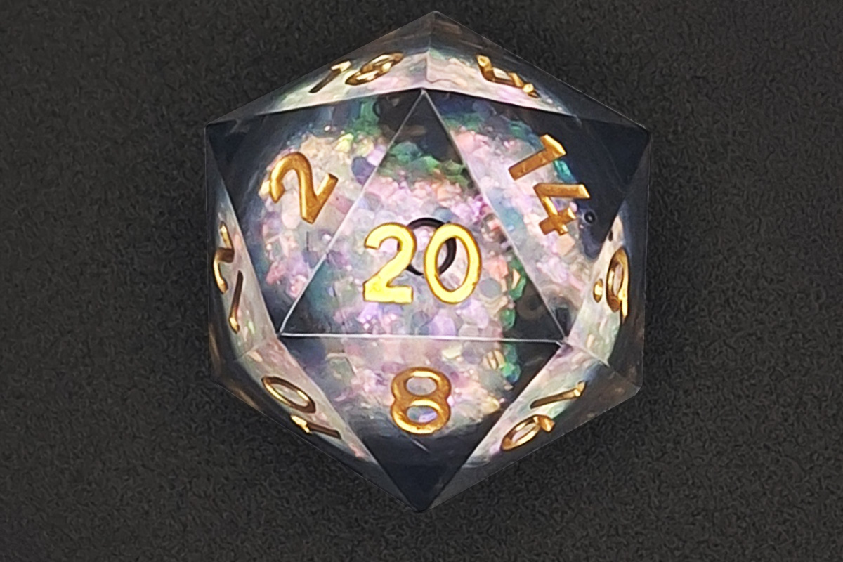 An oversized 33mm liquid core D20 with sharp edges and a premium finish, designed to stand out at the table.