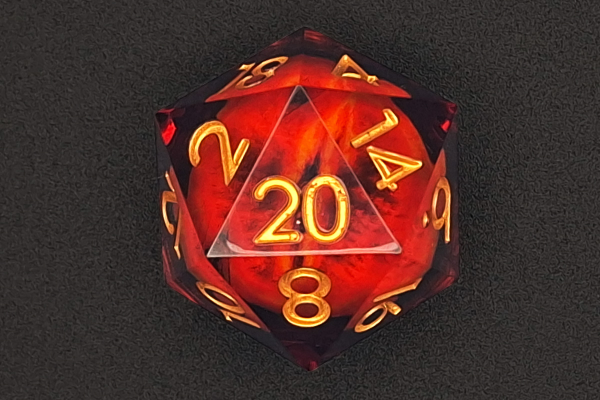 The Eye of Power is an oversized 33mm sharp-edged D20 designed to command attention the moment it hits the table. Suspended within the die is a free-moving eye core that shifts and follows the motion of every roll, creating an unsettling, captivating focal point that feels alive in your hand.